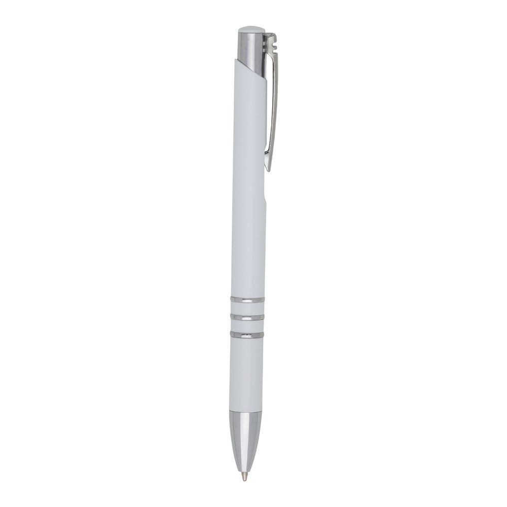 Descrição: Caneta plástica inteira colorida com detalhes em prata. Ponta do acionador preto e clip metal, possui 3 anéis inferiores. Aciona por clique.