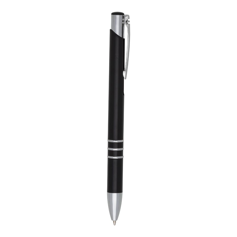 Descrição: Caneta plástica inteira colorida com detalhes em prata. Ponta do acionador preto e clip metal, possui 3 anéis inferiores. Aciona por clique.