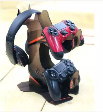 Suporte com Sistema de Montagem Encaixe e Cole MDF 3 mm Recortado a Laser. Apoio para 2 Controles + fone, podendo ser usado para PS4 ou XBOX.